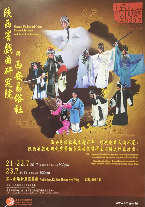 “香港•中国戏曲节”由香港特区政府康乐及文化事务署主办,自2010年推出以来,至今已举办八届。每年夏季,中国戏曲节除了进行各地方戏曲剧种经典剧目展演及经典戏曲电影展映外,还会邀请多位专家学者、以及演员艺术家举办讲座,旨在更有效率的普及戏曲,也给了戏迷近距离接触台下名角儿的机会。据了解,今年中国戏曲节为了庆祝香港回归祖国和香港特别行政区成立二十周年,主办方精心选调了更强劲的演员阵容和更精彩的演出节目,共邀请了中国国家京剧院一团、北京京剧院、上海越剧院、江苏省苏州昆剧院、重庆市川剧院和陕西戏曲演出团等为数不多的内地戏曲院团,于6月13日至8月12日进行集中展演。由我院及易俗社组成的陕西演出团一行,将于7月21-23日在香港高山剧场演出三场陕西地方戏曲经典折子戏专场,届时将为香港观众带来极富陕西地域特色的戏曲盛宴,让观众从多角度领略陕西地方戏曲的韵味与风采。